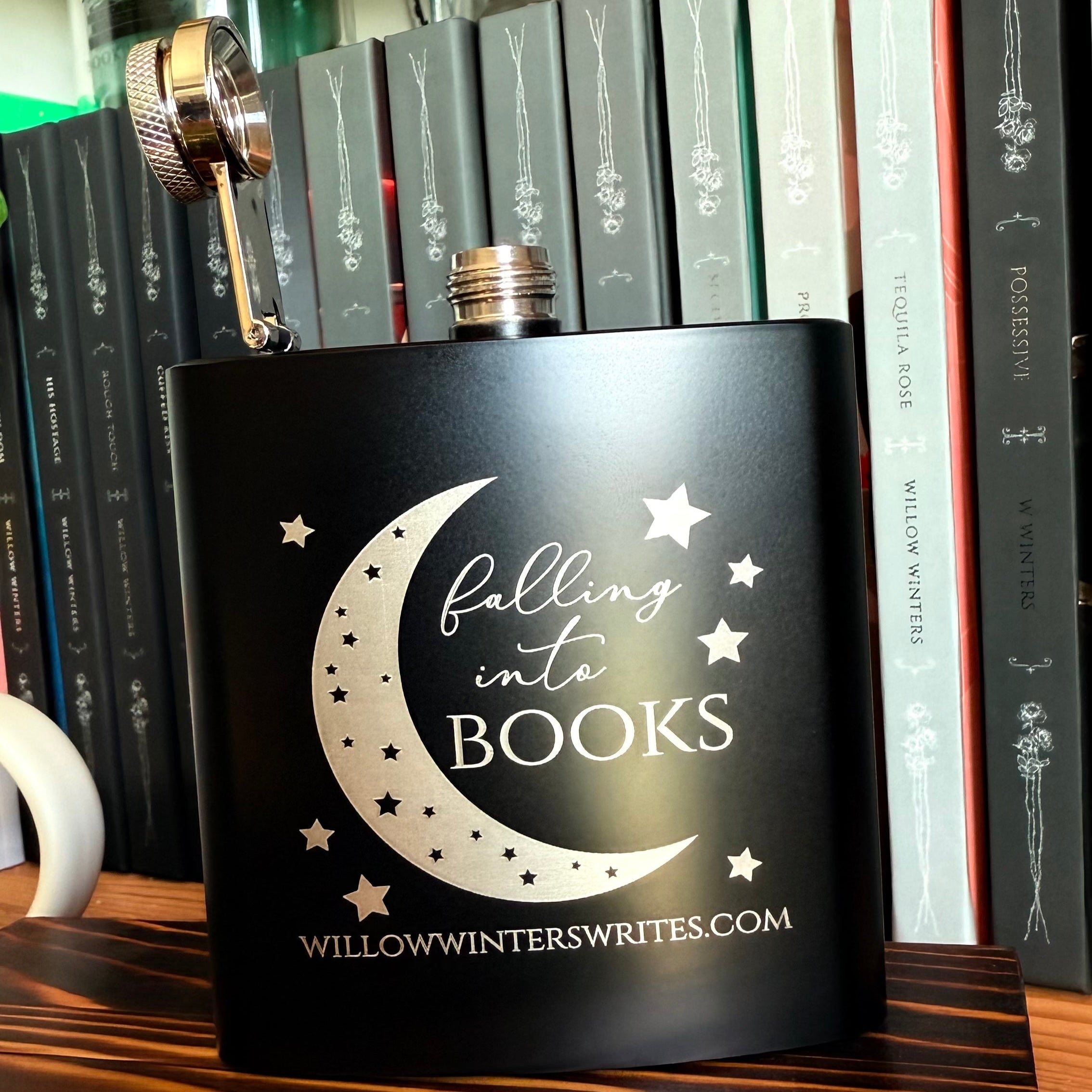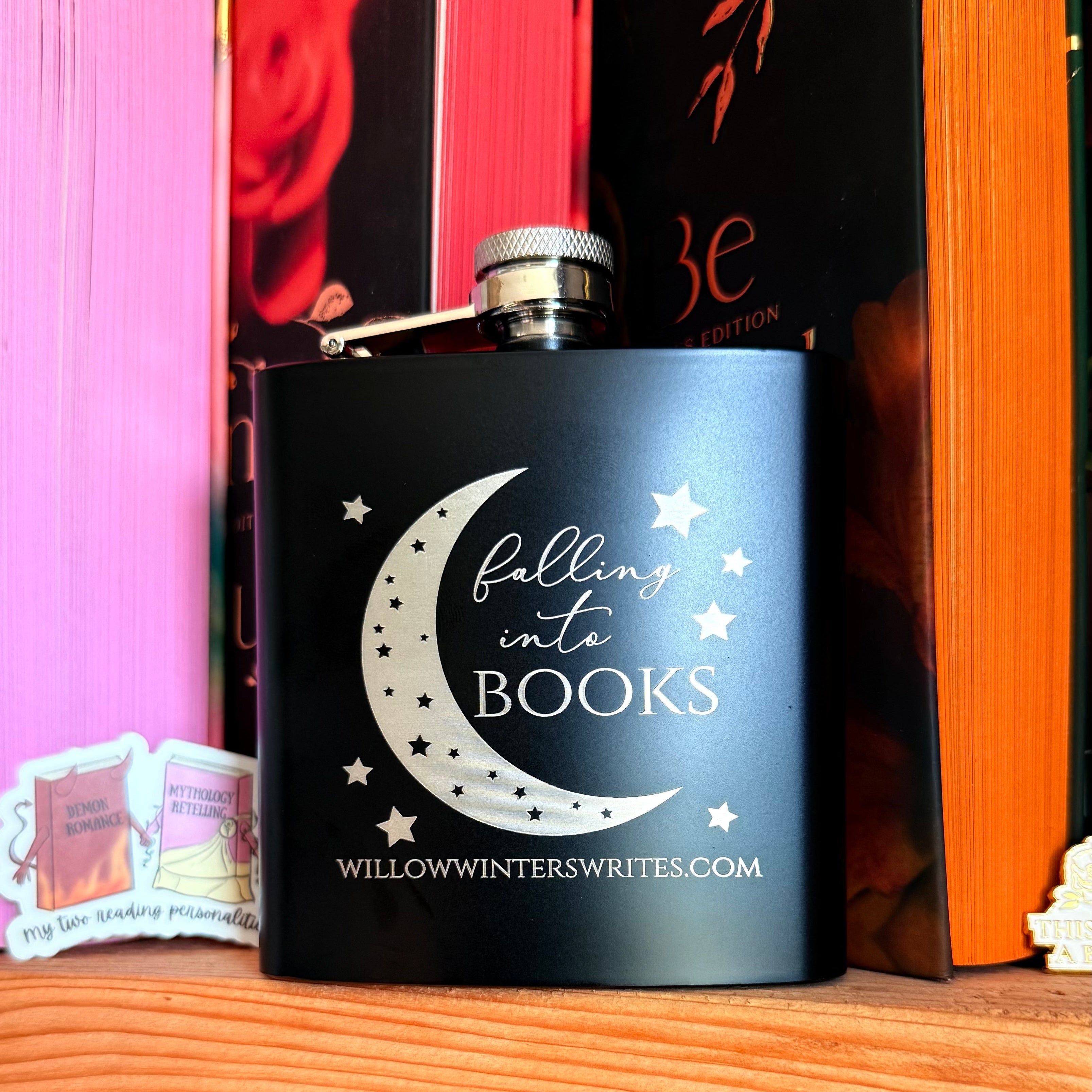 This sleek black flask features a silver moon-and-stars design with the words “Falling Into Books.” Perfect for sneaking a little extra warmth into your reading nights or packing for book club gatherings, it’s a discreet and stylish must-have for every romance reader who likes their stories—and their drinks—a little stronger.