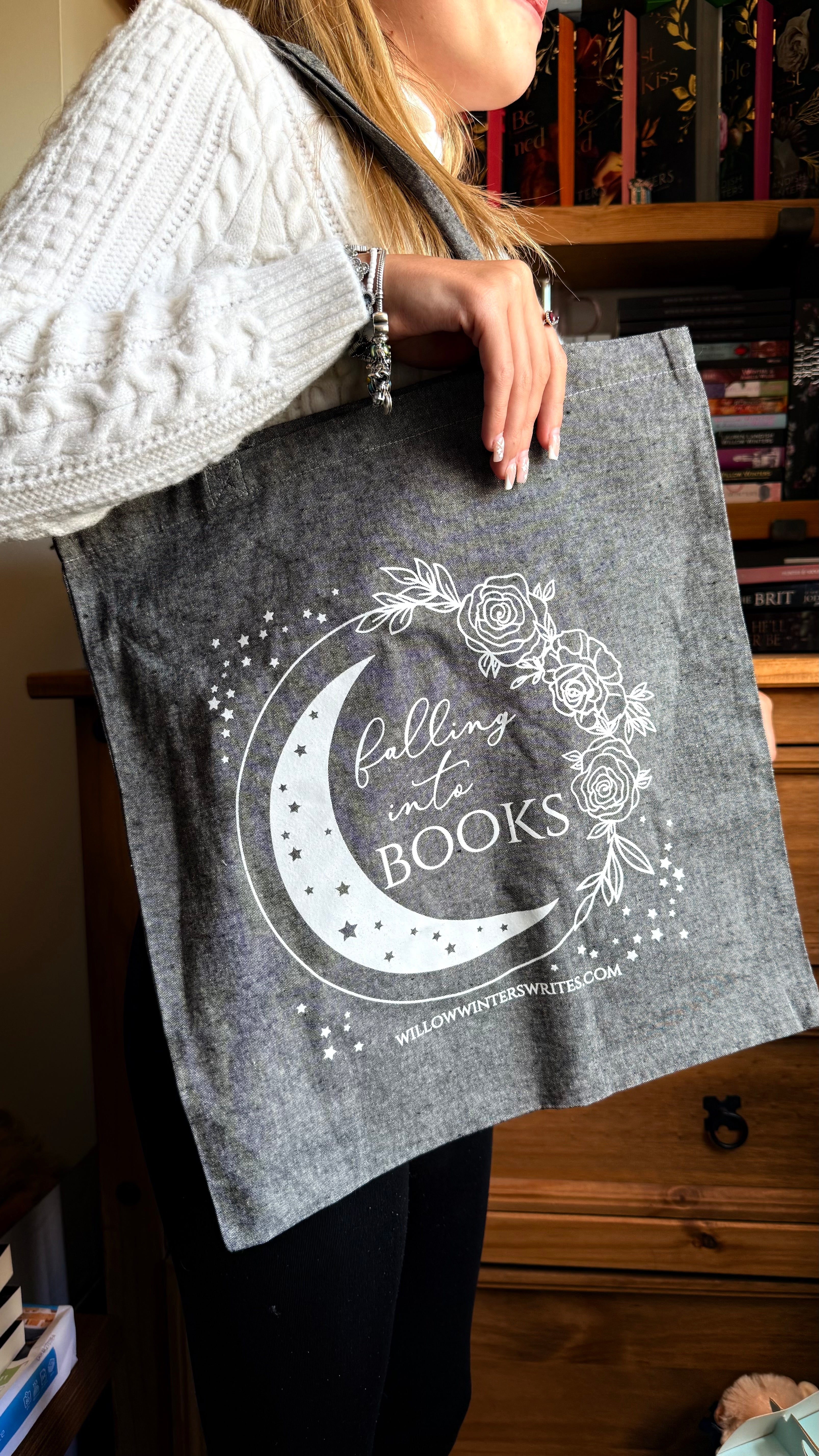 This chic gray tote features a dreamy moon-and-roses design with the phrase “Falling Into Books.” It’s the perfect everyday bag for book hauls, errands, or cozy library trips. A must-have for romance readers who love their accessories as bookish as their shelves.