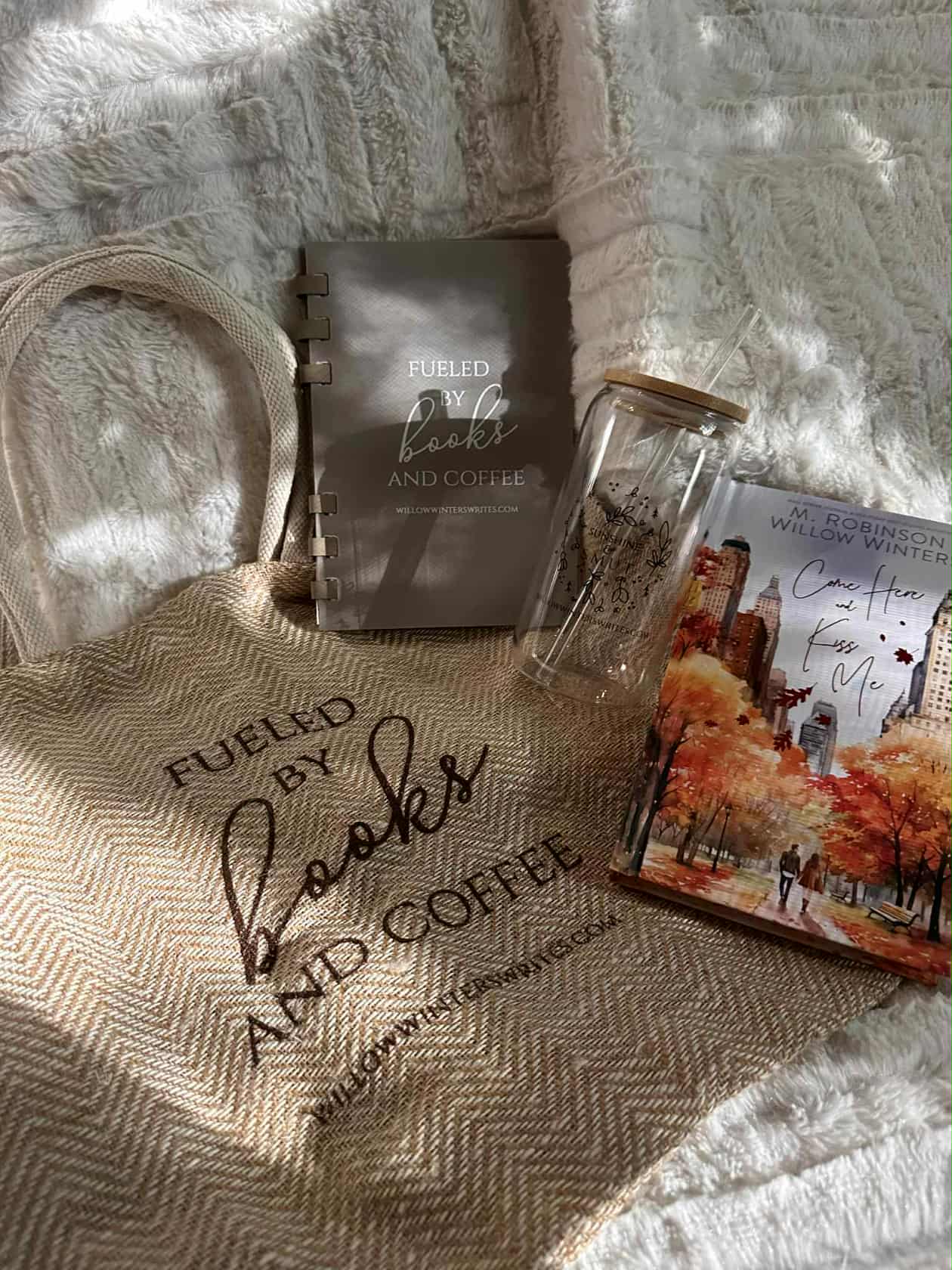 Celebrate Come Here and Kiss Me in its stunning special edition hardback, paired with an exclusive collection of matching “Fueled by Books and Coffee” merch!