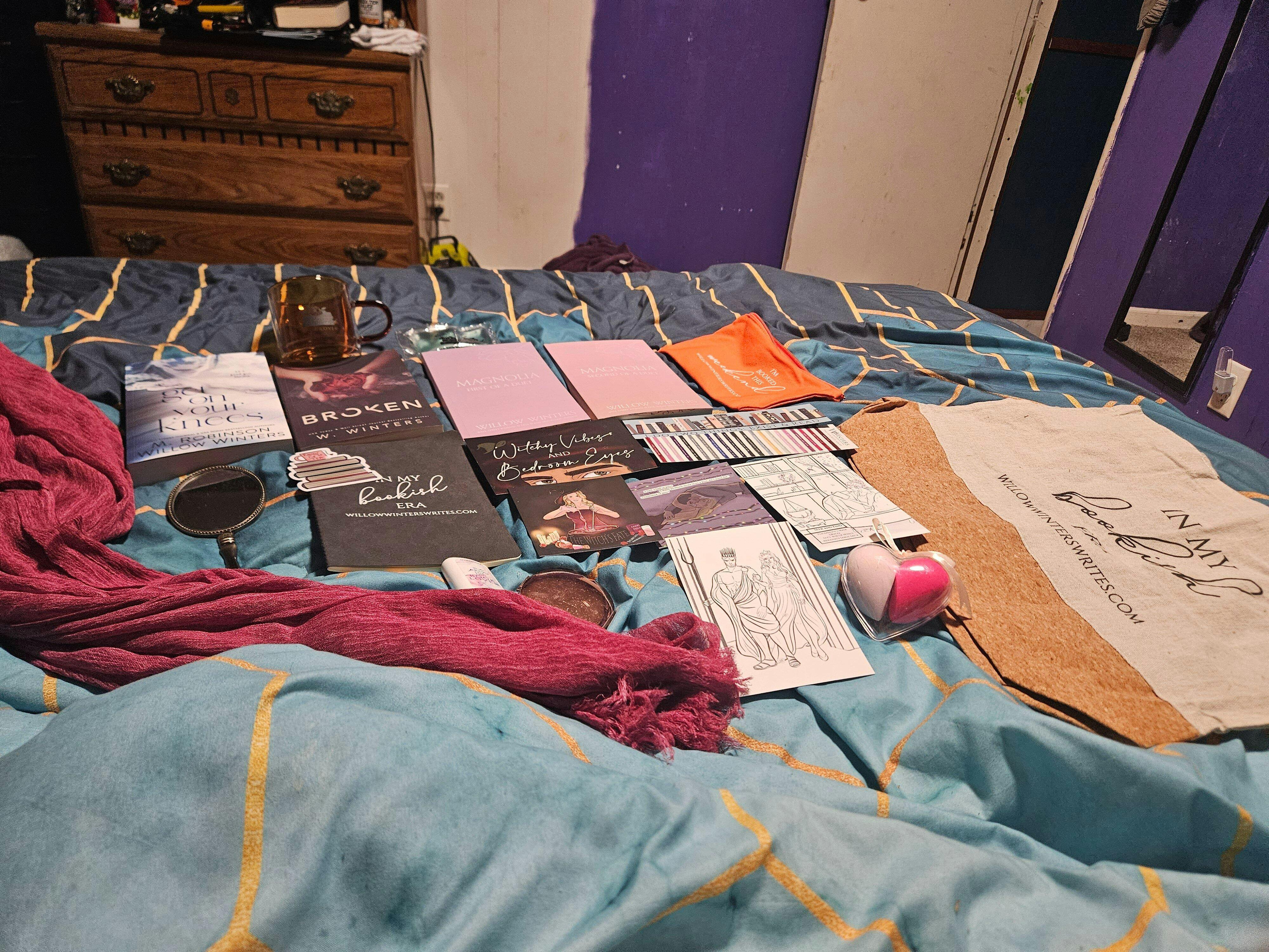 - We only offer a mixture of books and merch (quantities below), all book boxes, or all merchandise boxes. Please be CLEAR IN YOUR NOTES when indicating to us what box you’d like!